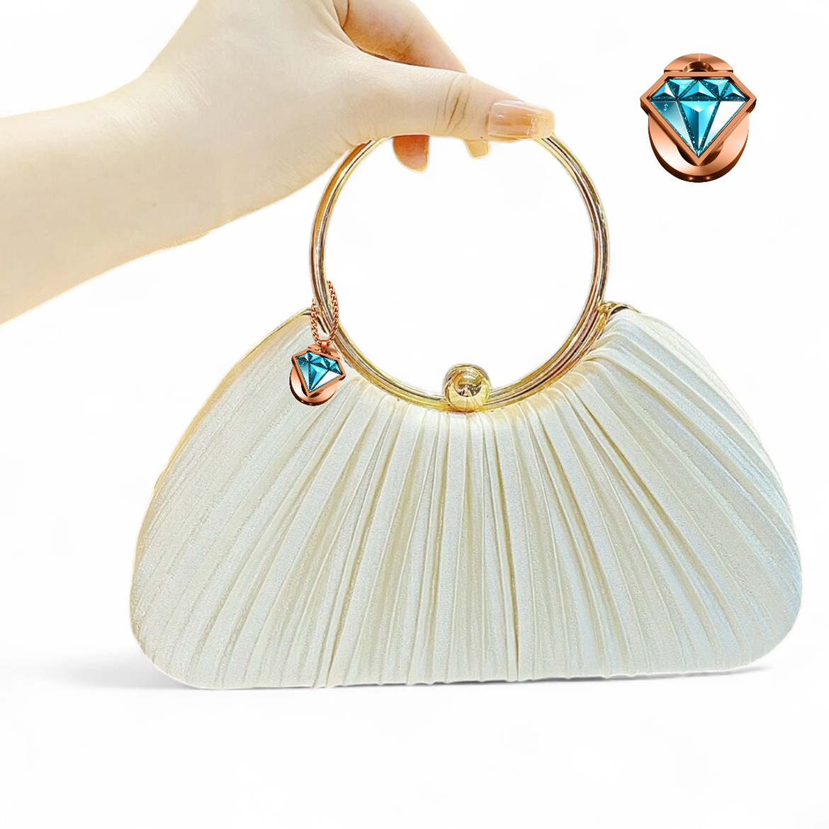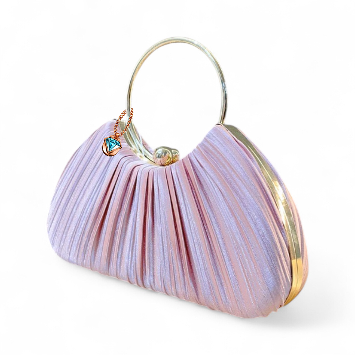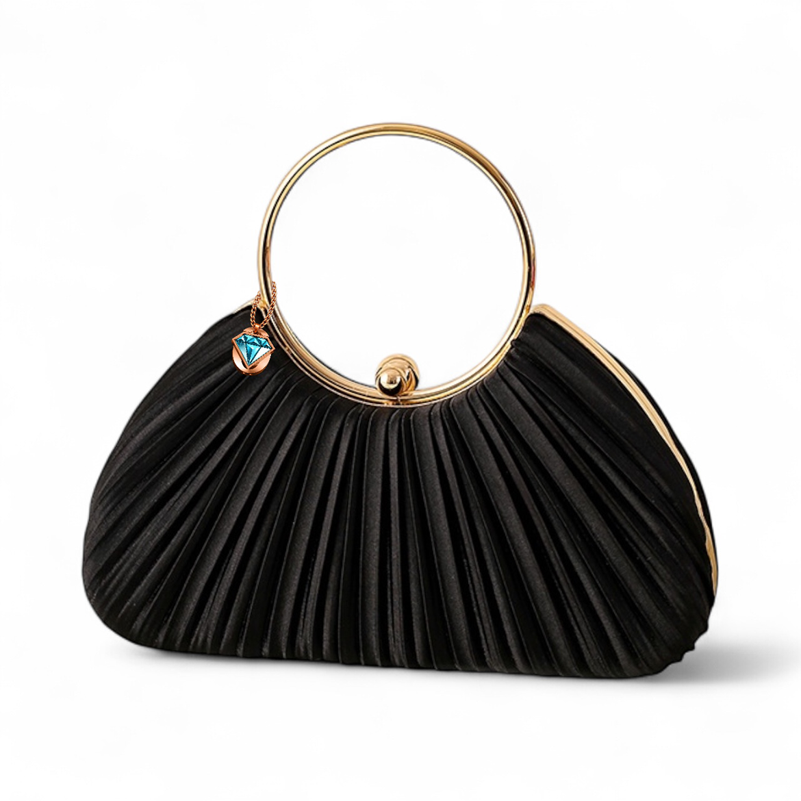 The Elegon Model Maldives Bag captures the light, ethereal atmosphere of the island paradise. This delicate pleated satin clutch has a soft, voluminous half-moon shape, mirroring tranquil ocean ripples. At 23 x 8 x 19 cm and just 0.5 kg, it is perfectly sized for evening strolls. The golden loop handle adds a touch of resort-ready elegance. Ideal for beach weddings, sunset cocktails, or luxury resort dinners where graceful lightness is key.