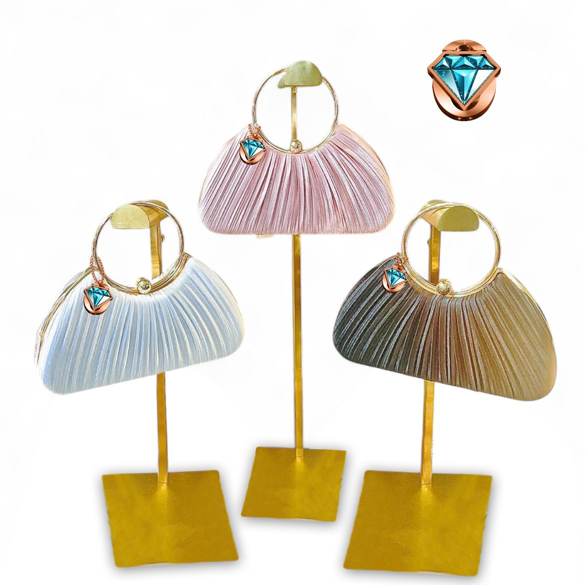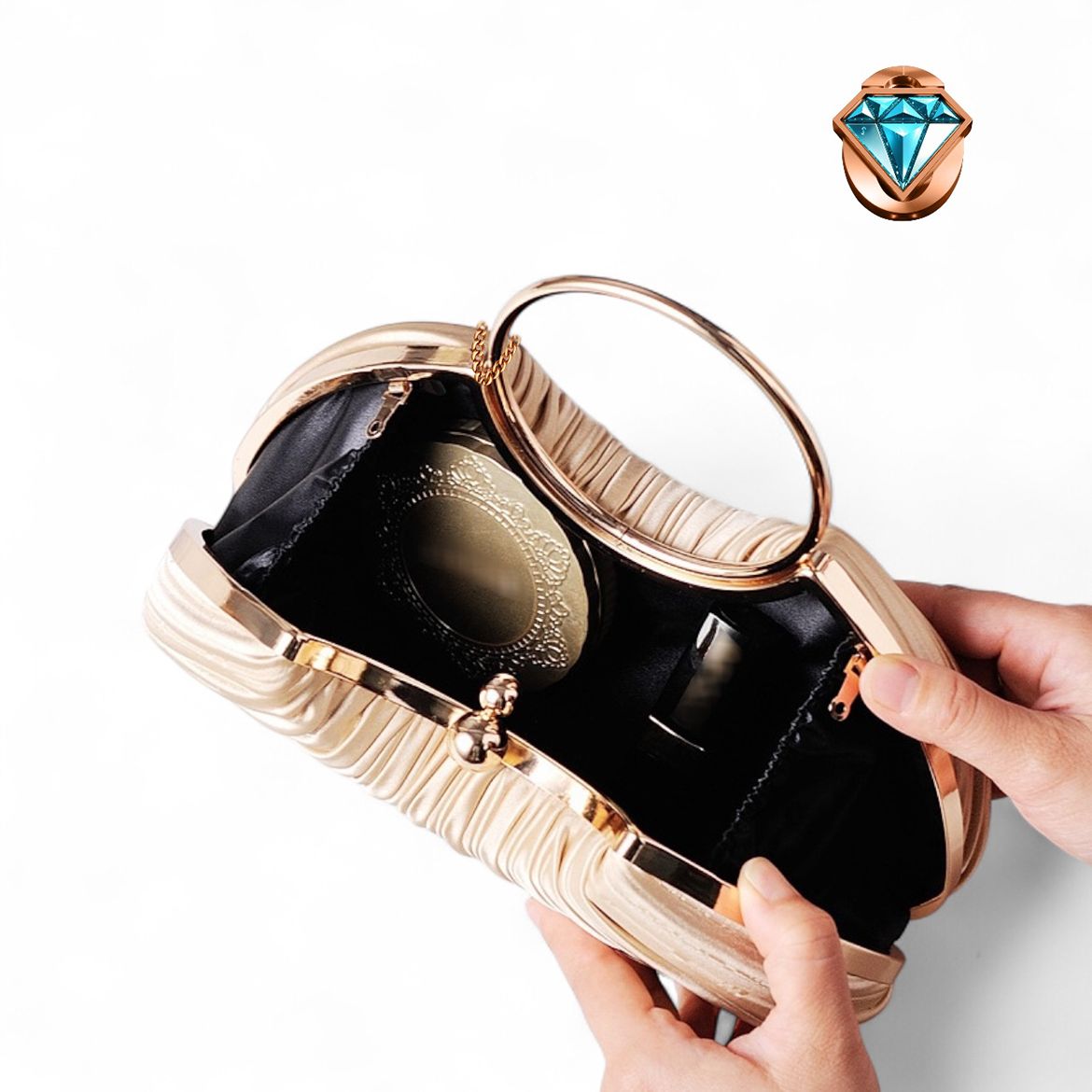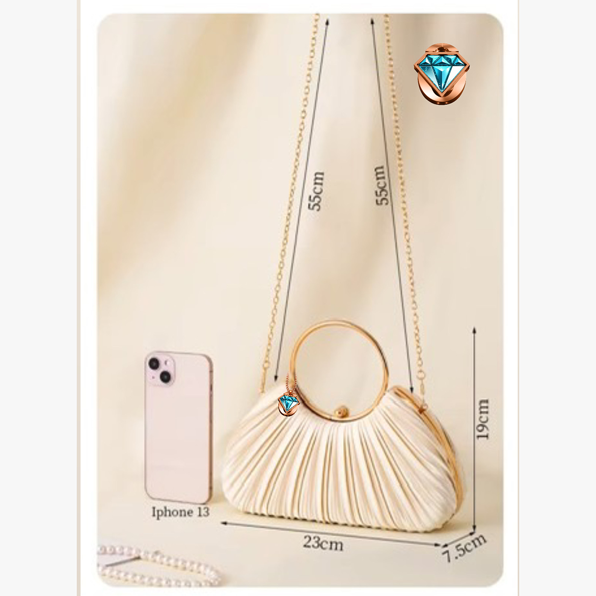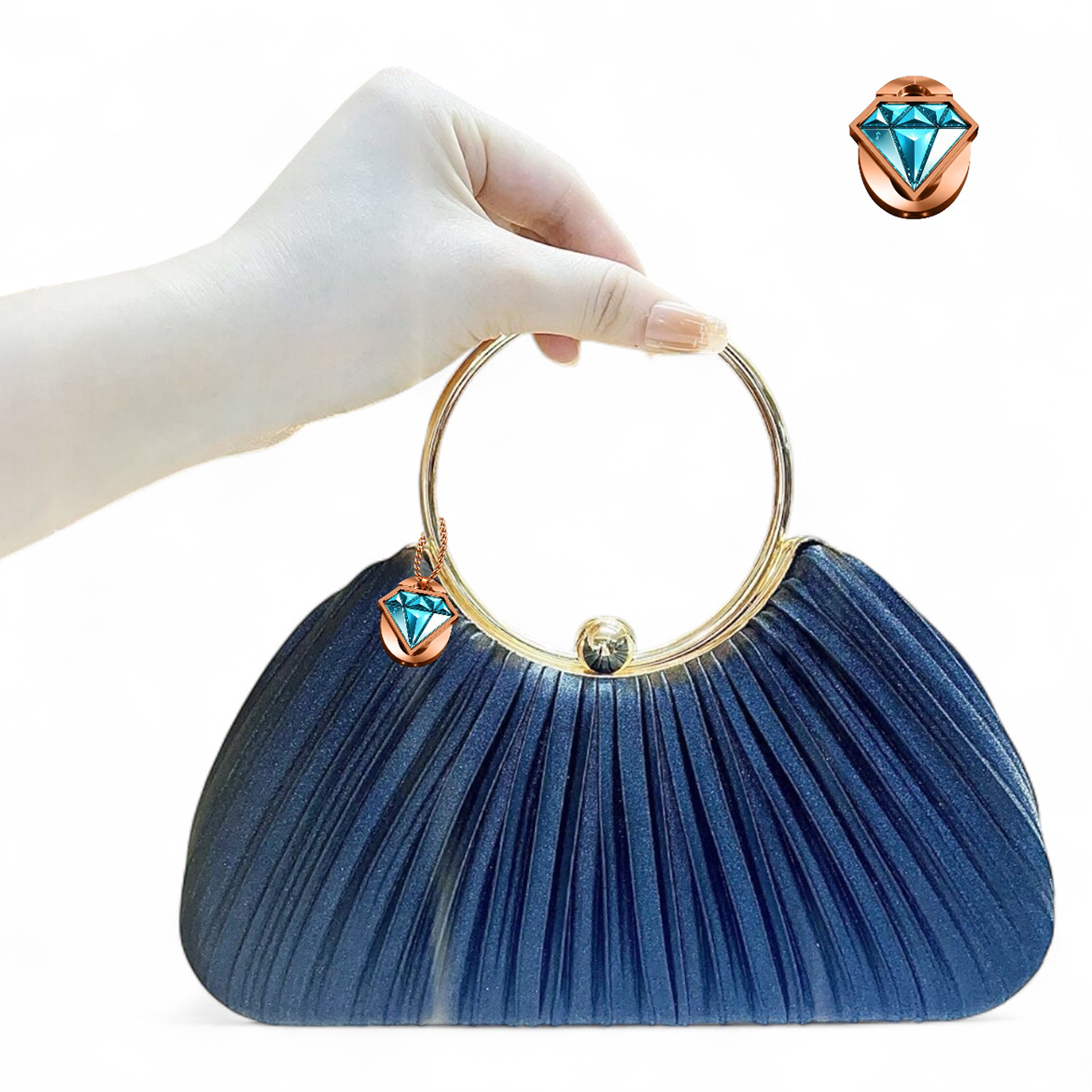 The Elegon Model Maldives Bag captures the light, ethereal atmosphere of the island paradise. This delicate pleated satin clutch has a soft, voluminous half-moon shape, mirroring tranquil ocean ripples. At 23 x 8 x 19 cm and just 0.5 kg, it is perfectly sized for evening strolls. The golden loop handle adds a touch of resort-ready elegance. Ideal for beach weddings, sunset cocktails, or luxury resort dinners where graceful lightness is key.