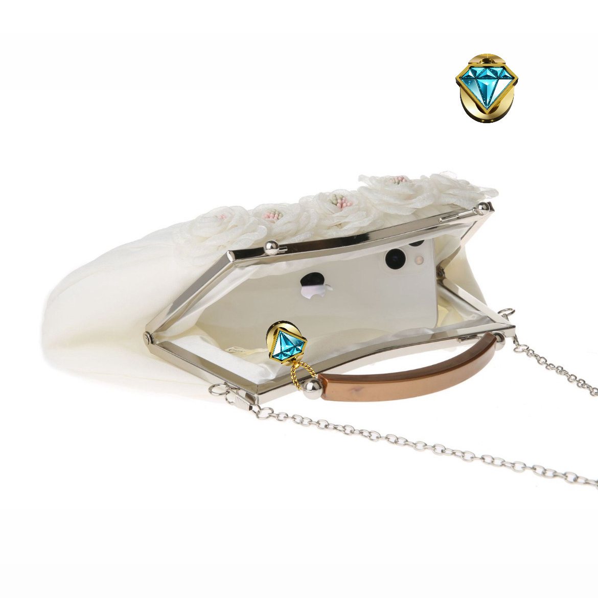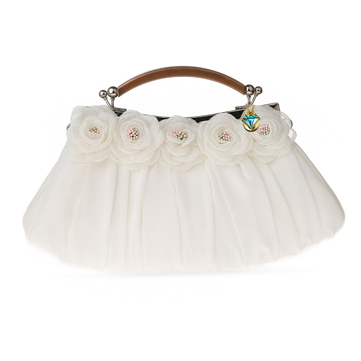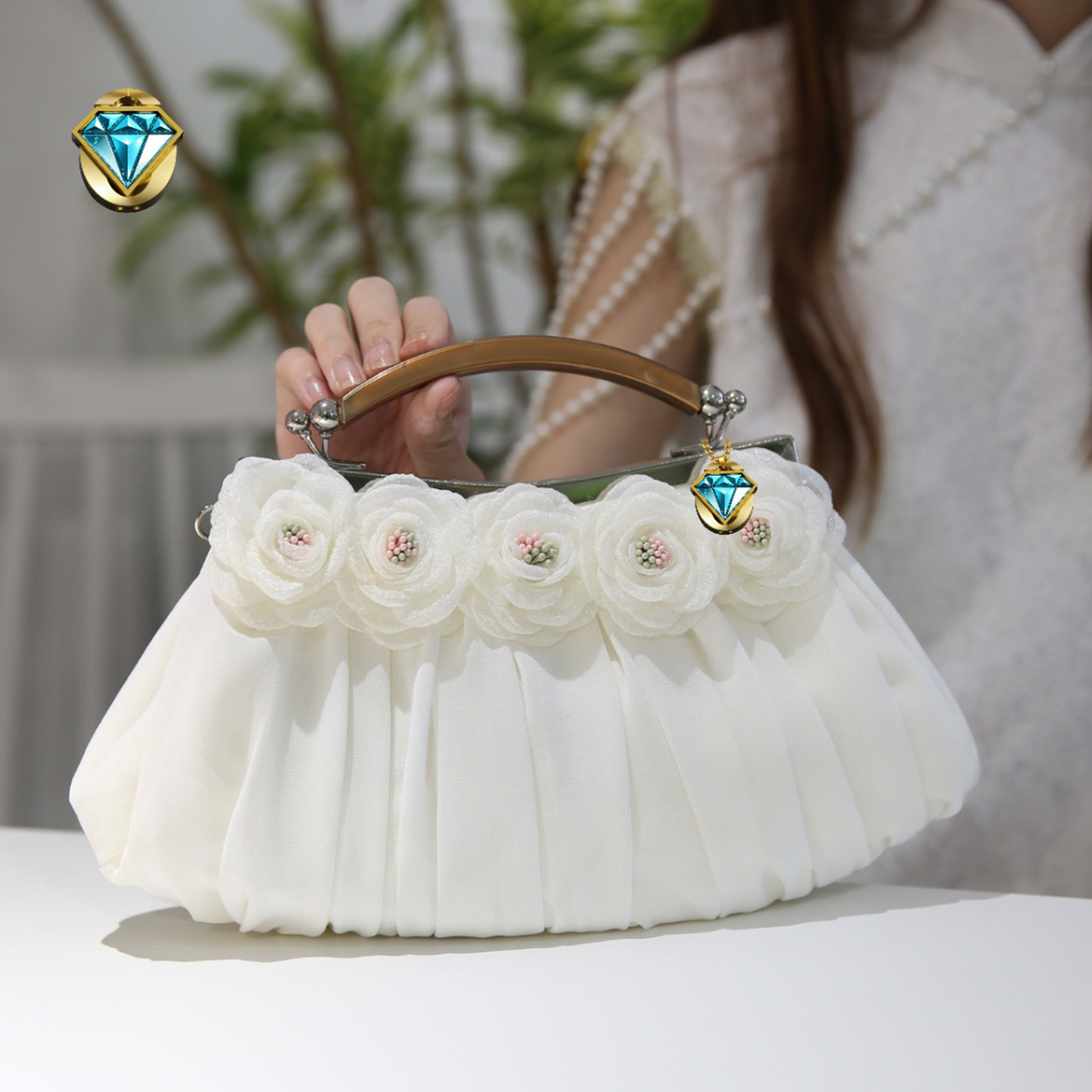 The Elegon Model Montenegro Bag reflects the stunning contrast of the Bay of Kotor. Its soft, pleated ivory chiffon body evokes the mist over the white limestone mountains, while the row of fabric roses adds textural depth. Finished with a rich, structured top handle, this 0.3 kg bag blends delicacy with strength. Sized 29 x 4 x 18 cm, it is perfectly proportioned for elegance. Ideal for upscale resort events, seaside weddings, or evening affairs where natural grace is paramoun